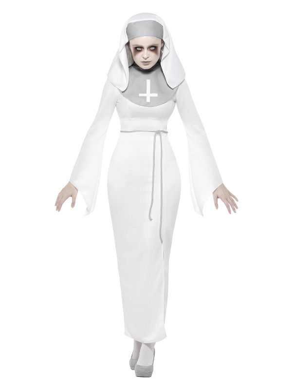 Haunted Asylum Nun Costume, White, with Dress, Belt & Headpiece