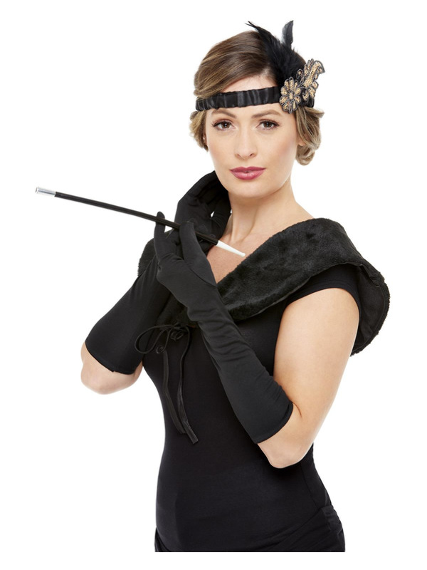 Deluxe 20s Accessories Kit, Black & Gold, with Gloves, Cigarette Holder, Headband & Stole